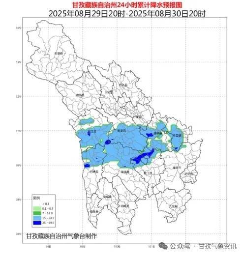 目前,甘孜州气象台继续发布暴雨蓝色预警:预计今天(8月29日)晚上到明天白天,白玉、新龙、道孚、丹巴及巴塘、理塘、雅江三县北部有大到暴雨。请各级各相关部门加强防范山洪、泥石流、崩塌、滑坡等地质灾害,强化监测、巡查、值守工作,做好主动预防、提前避险工作。