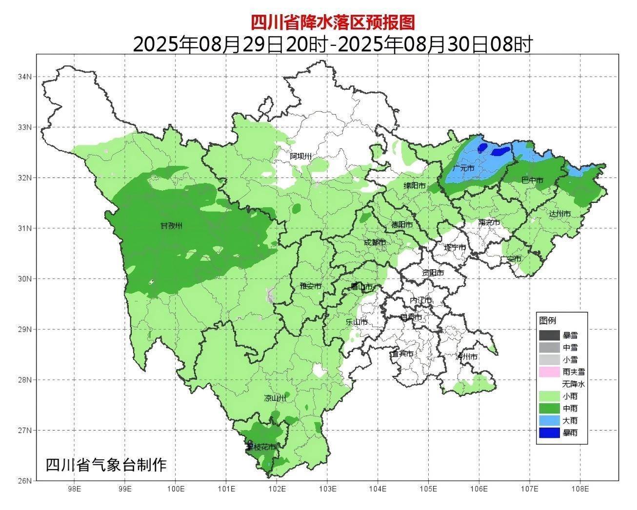 今天晚上,广元、巴中、达州3市的部分地方有中雨,局部大到暴雨;甘孜州中部和攀枝花市部分地方有中雨。